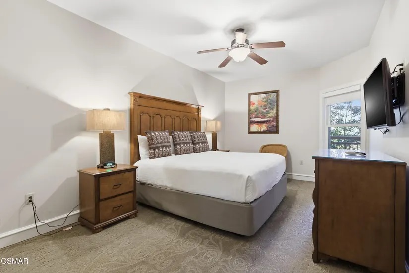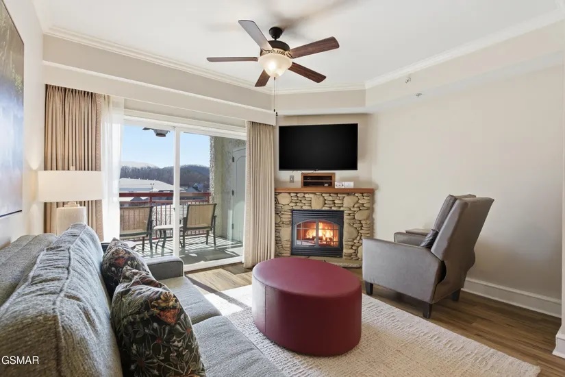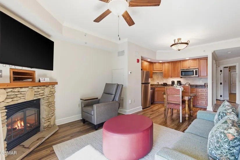 Rare opportunity to own a riverfront unit in the highly desirable Riverstone Resort in Pigeon Forge. This renovated unit is arguably in the most desired location in the resort, as it offers both views of the Little Pigeon River as well as the surrounding Great Smoky Mountains with intown location and convenience. The unit sits on the 4th floor with easy parking and elevator access. The condo features a beautiful living area with fireplace, a modern and updated kitchen, a large private bedroom with a tastefully updated en suite bathroom, and of course the outdoor balcony for taking in the flowing river and mountain scenery. The condo is being sold fully furnished and turnkey to its new owner.